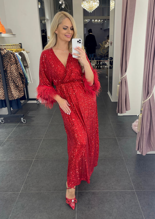 Sarkana garā fliteru kleita ar spalvu aprocēm