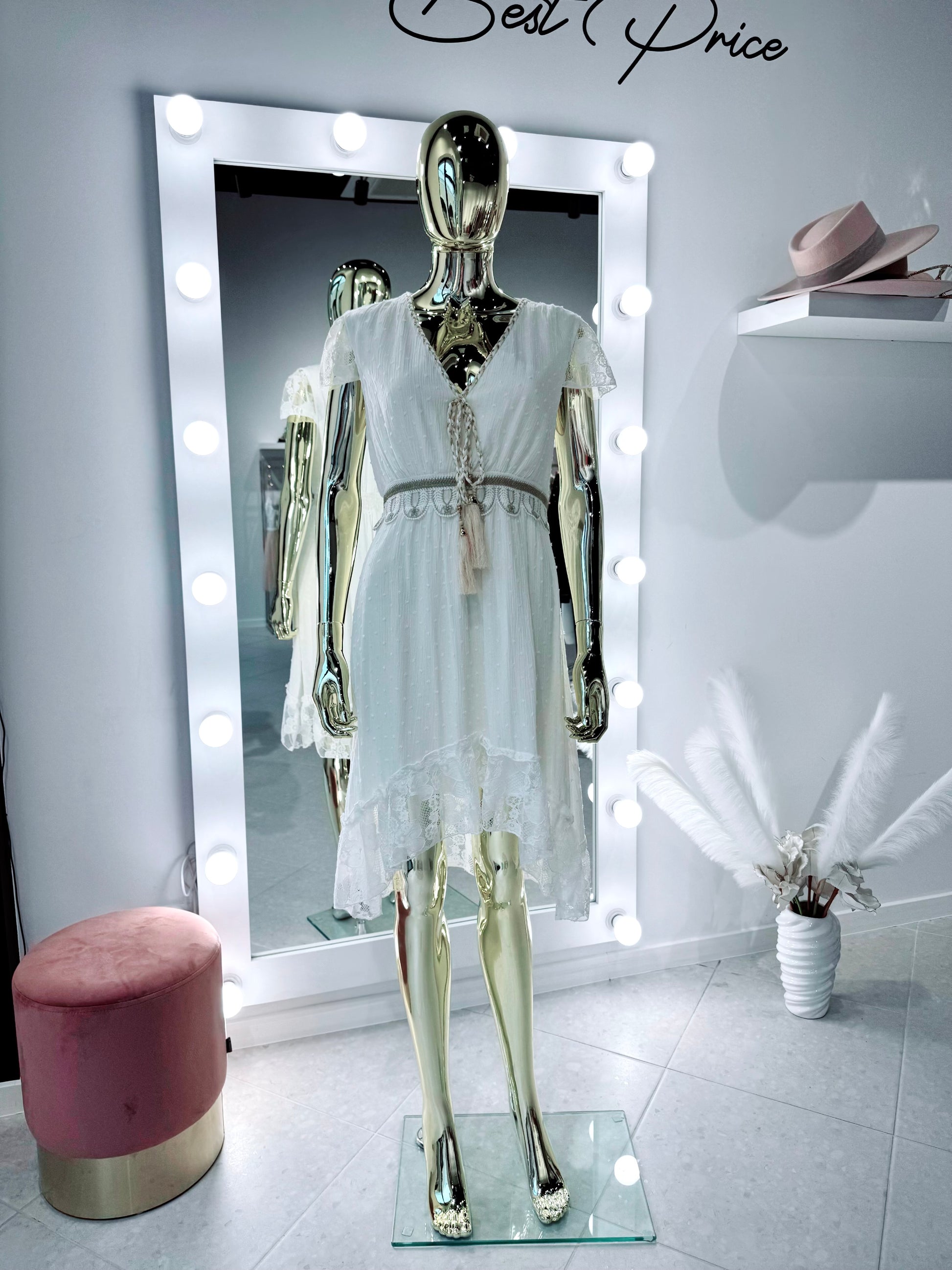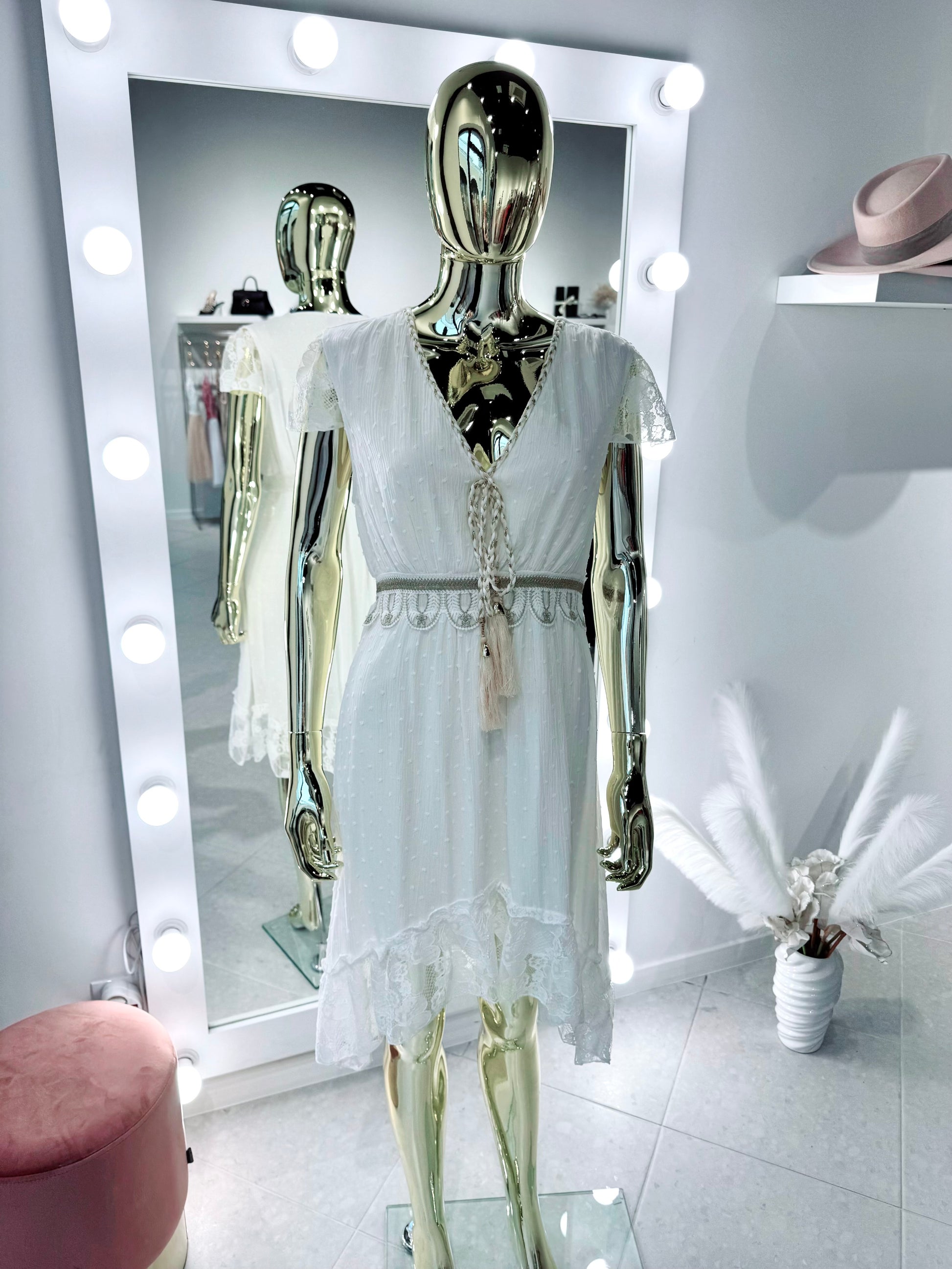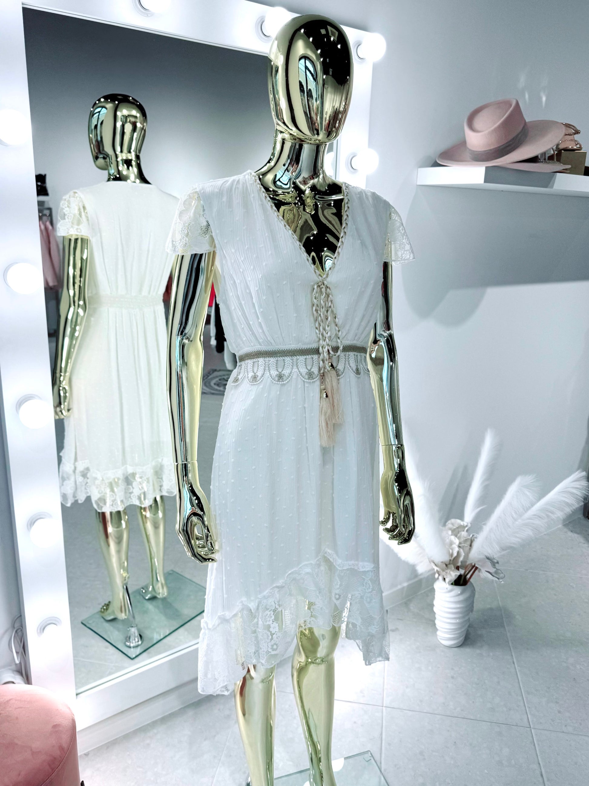 Krēmbalta kleita ar mežģīņu piedurknēm un apakšmaliņu.