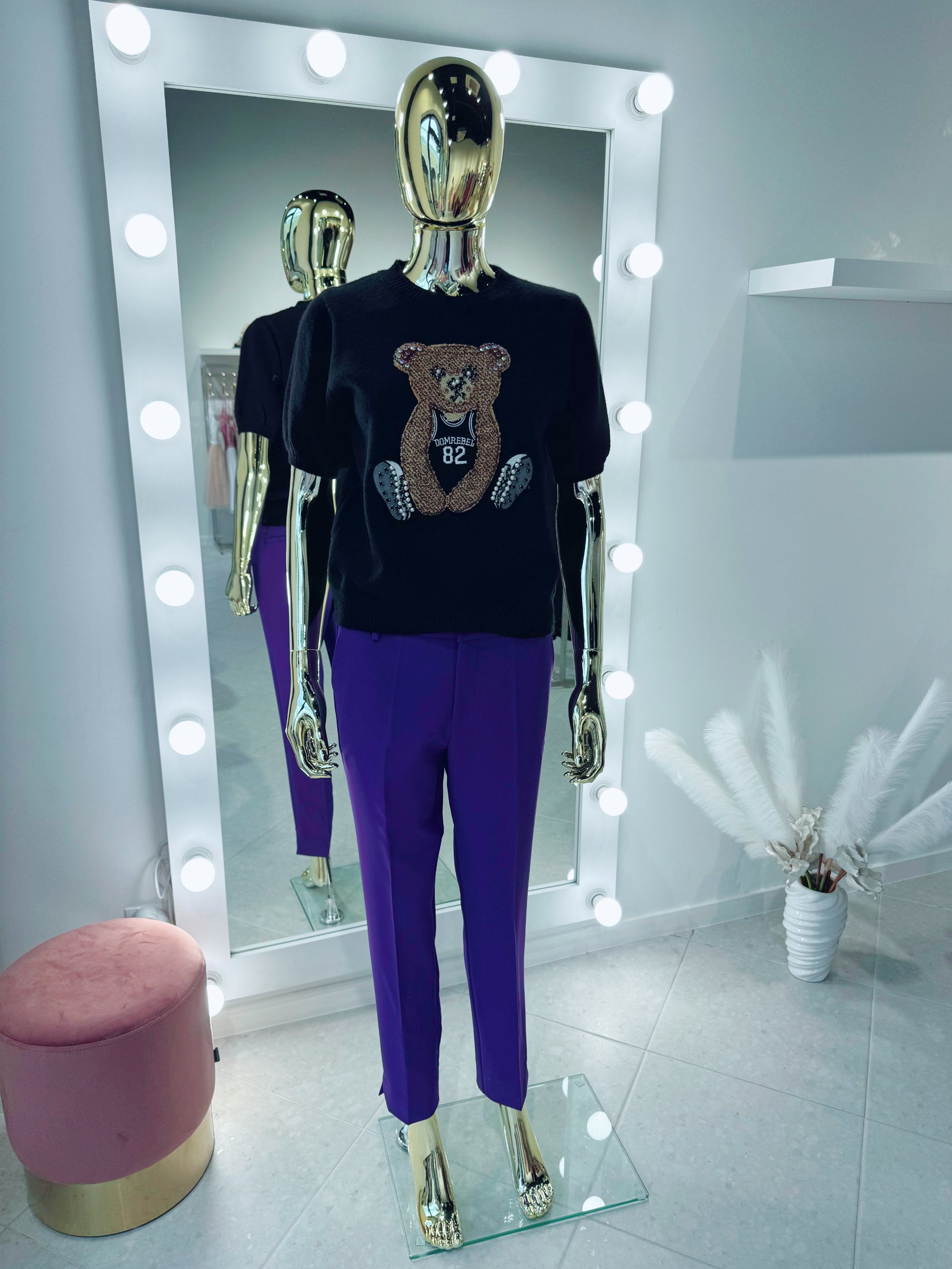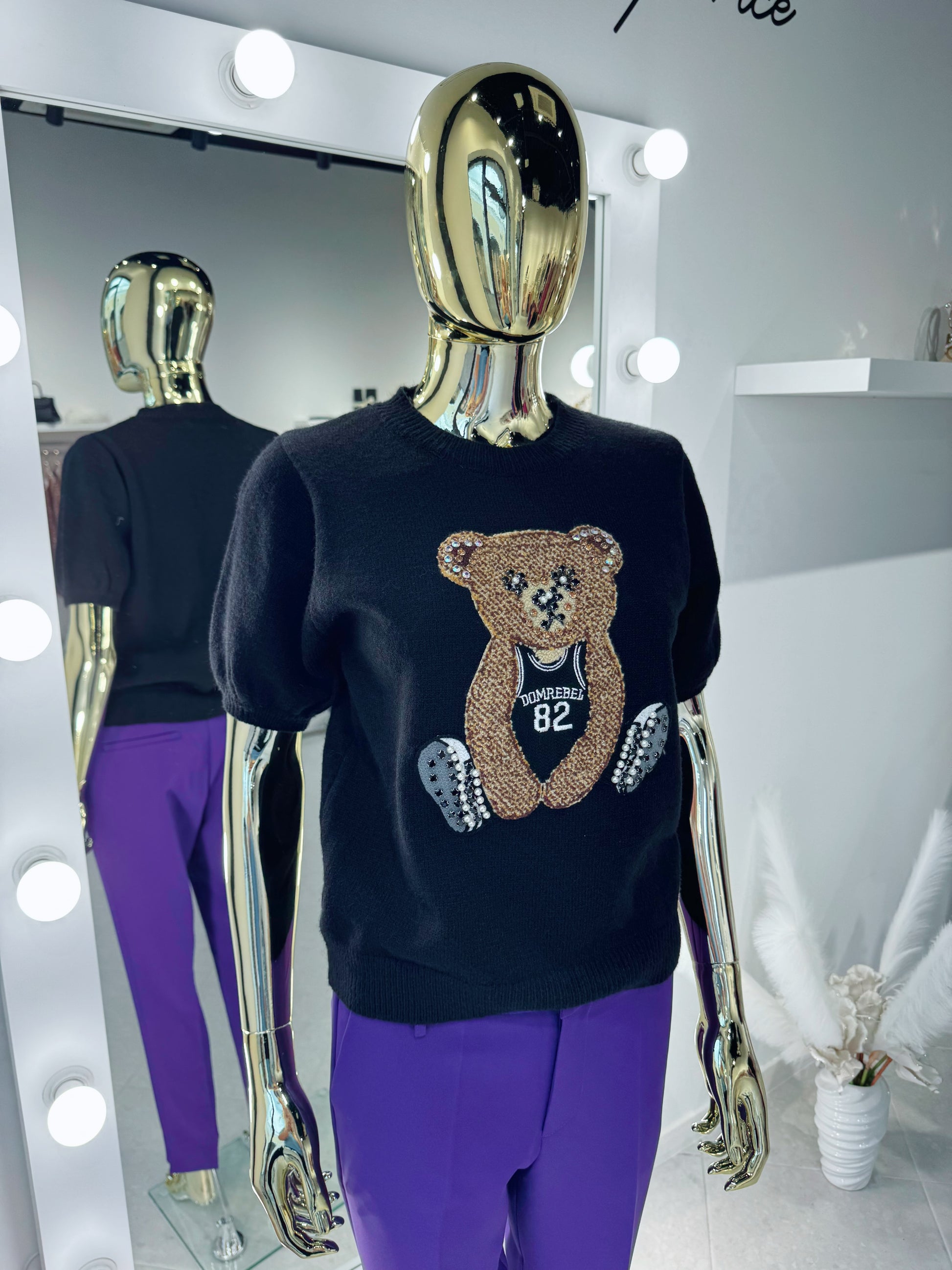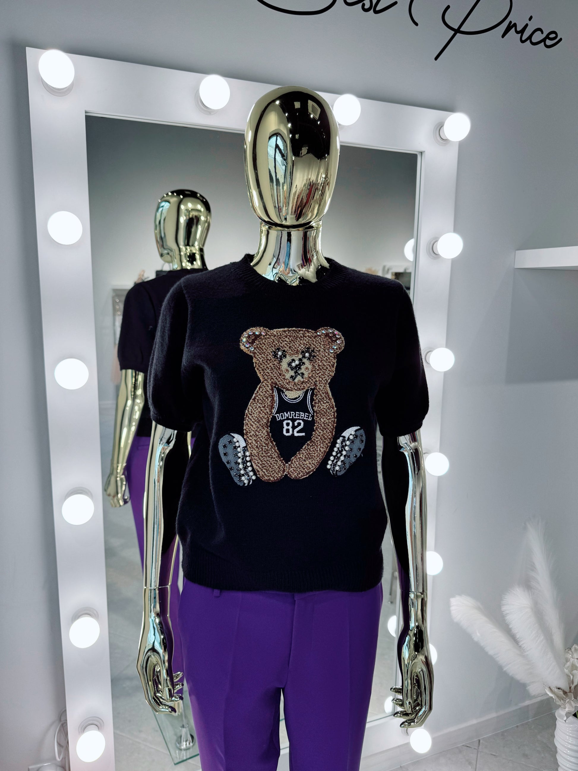 Melns džemperis ar īsām piedurknēm un dekoratīvu lāci.
