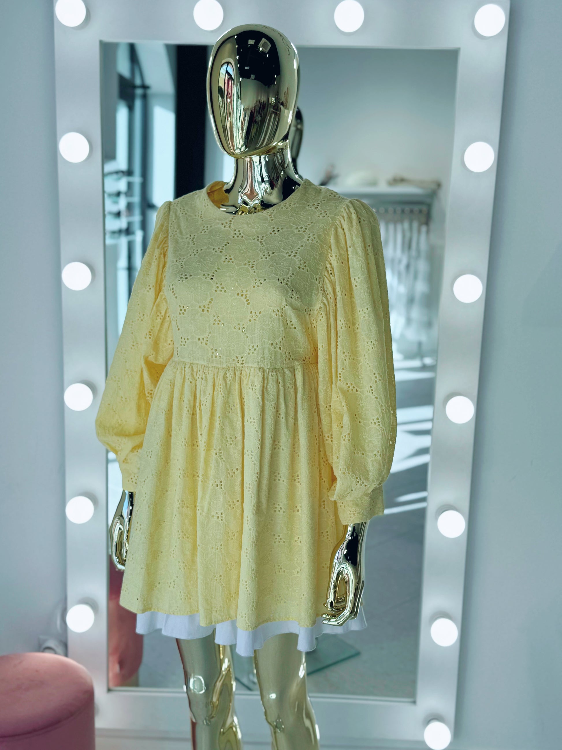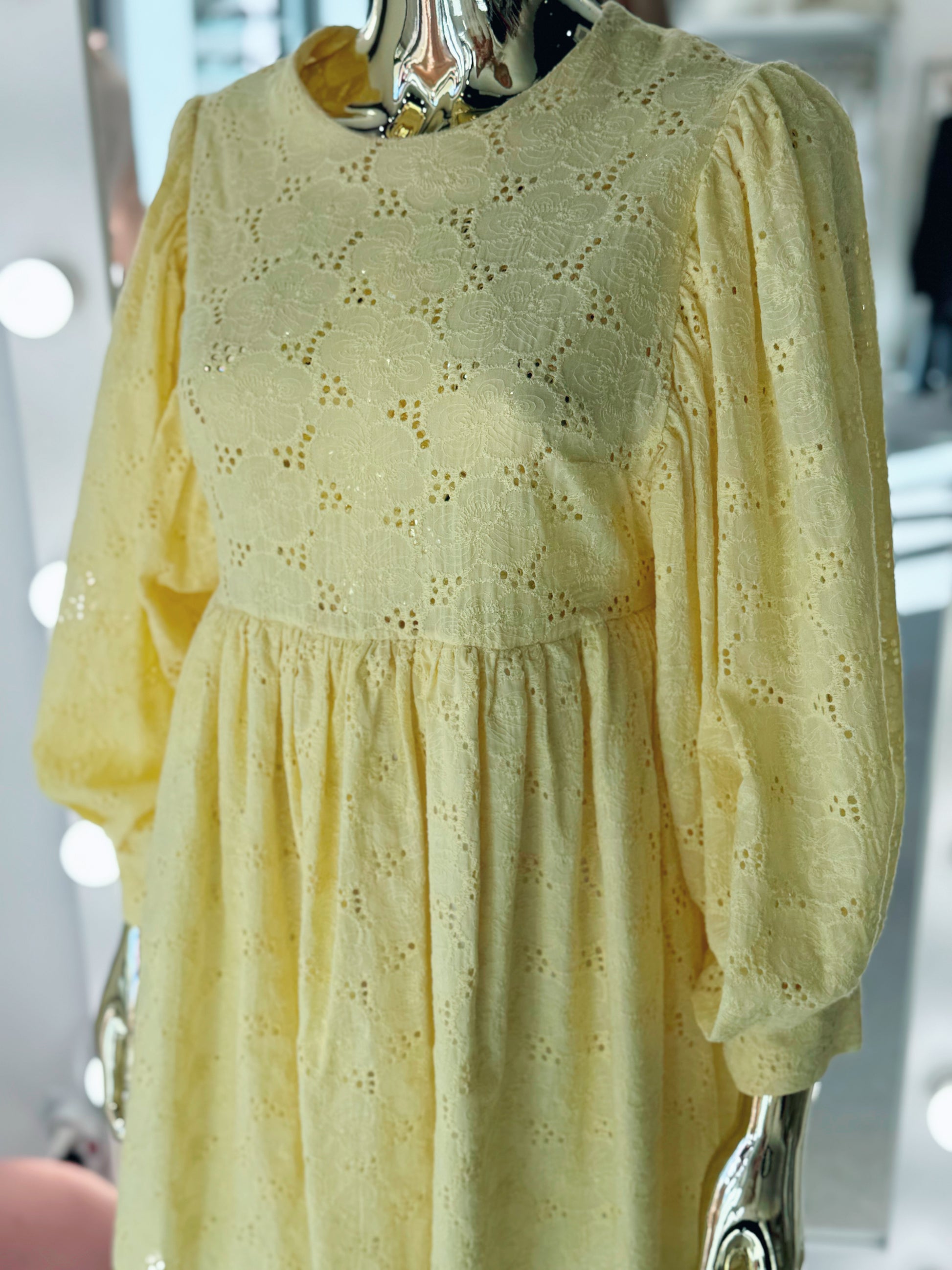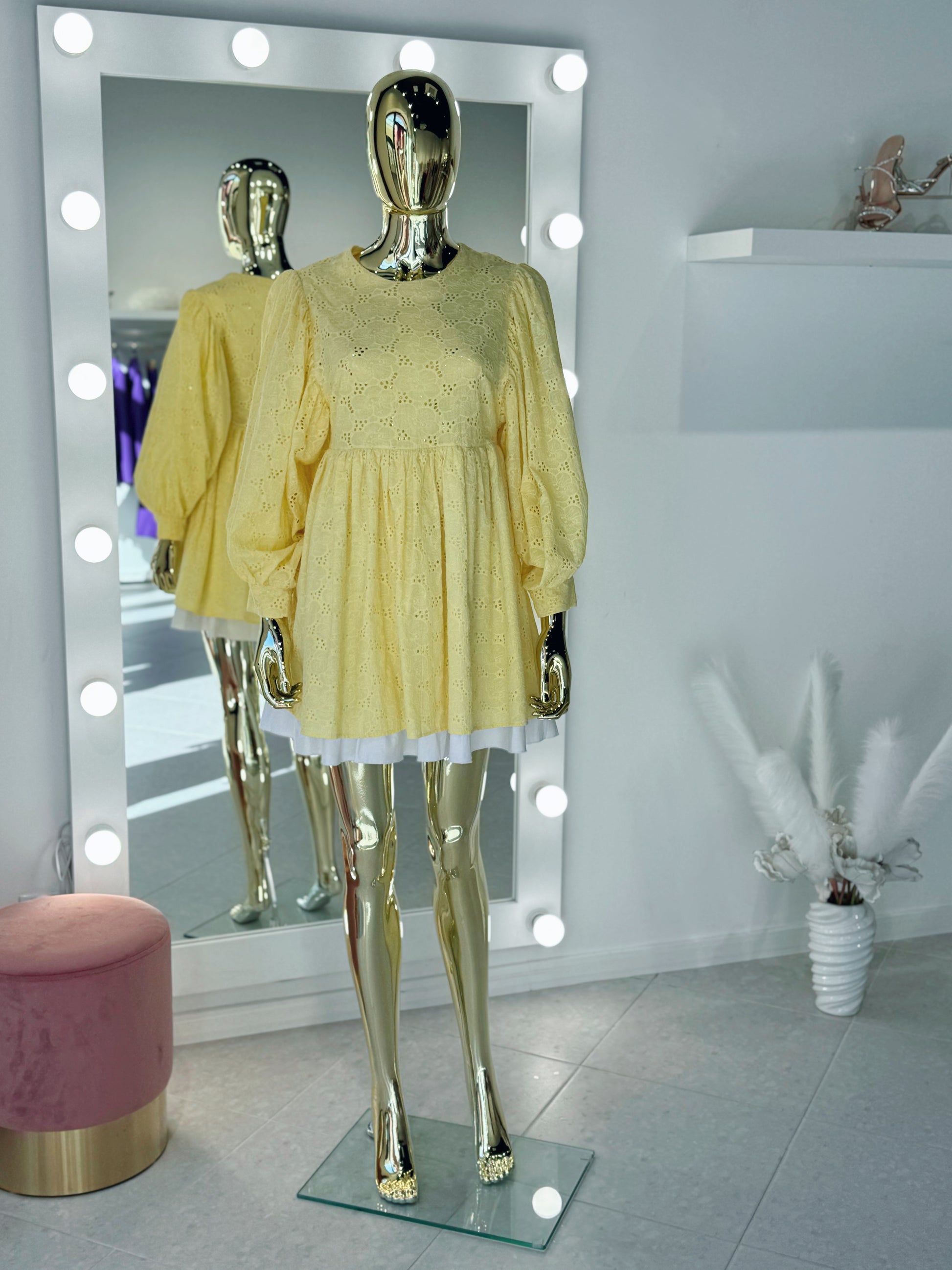 Dzeltena kupla kleita ar garām piedurknēm.